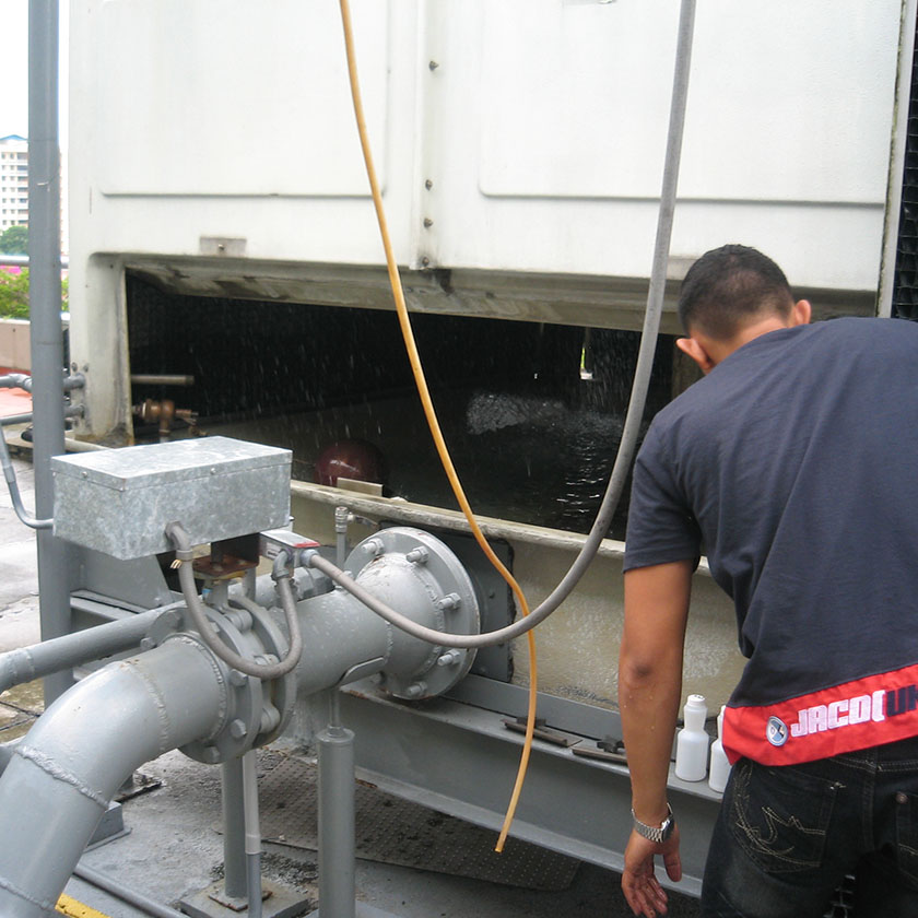 Aplicación de químicos para limpieza por incrustaciones en torres de enfriamiento.