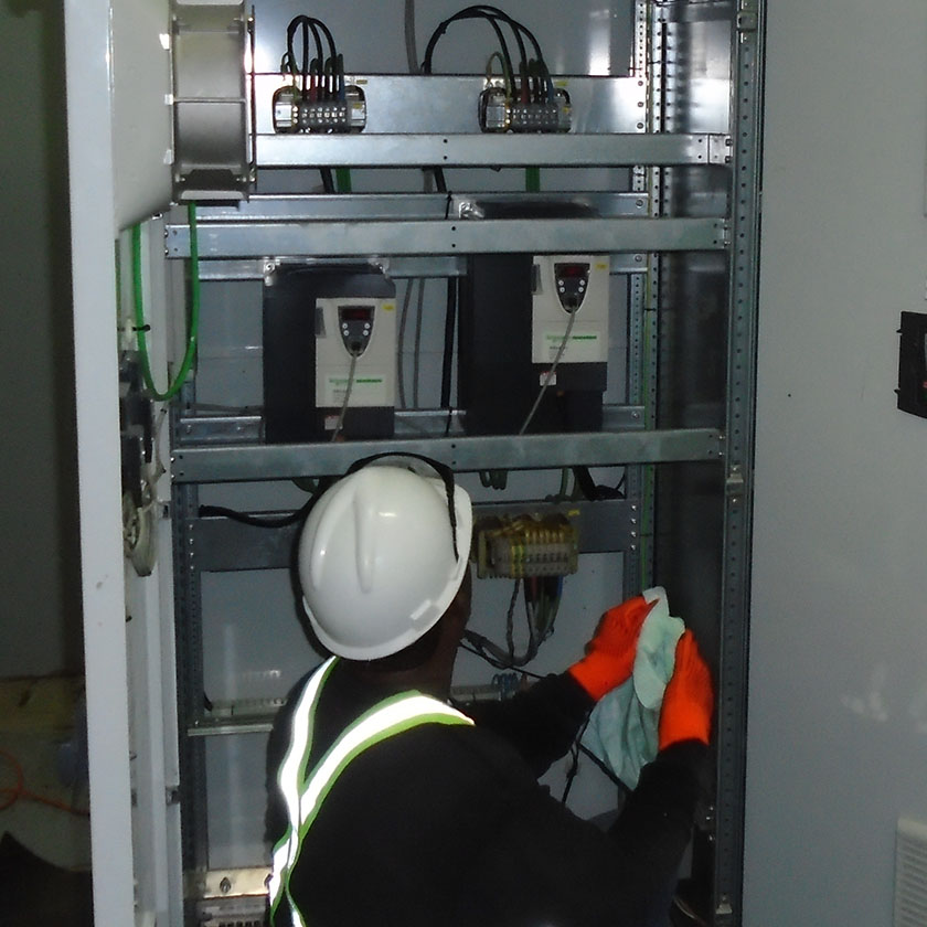 Limpieza y torqueado de terminales en tableros eléctricos.